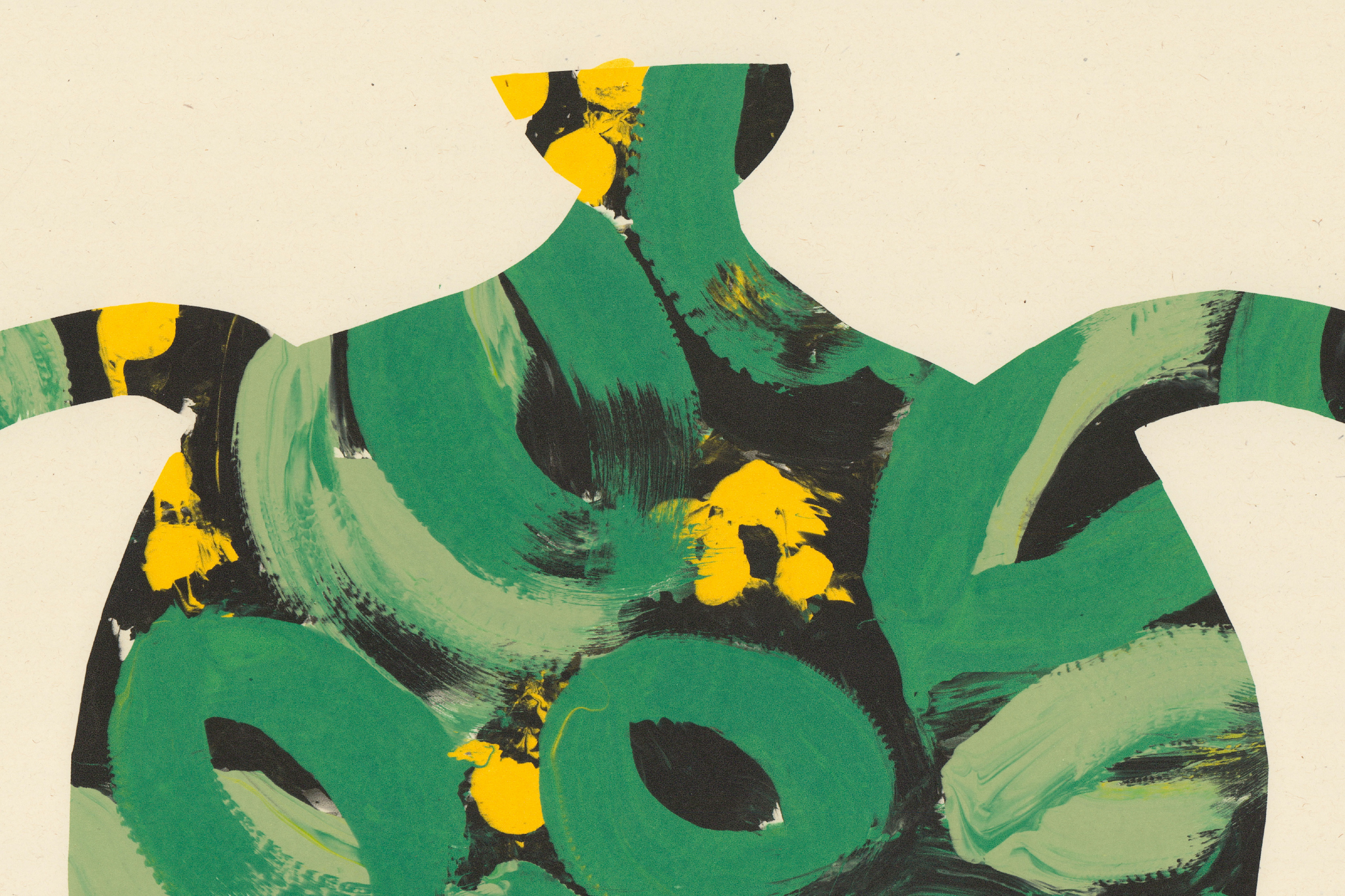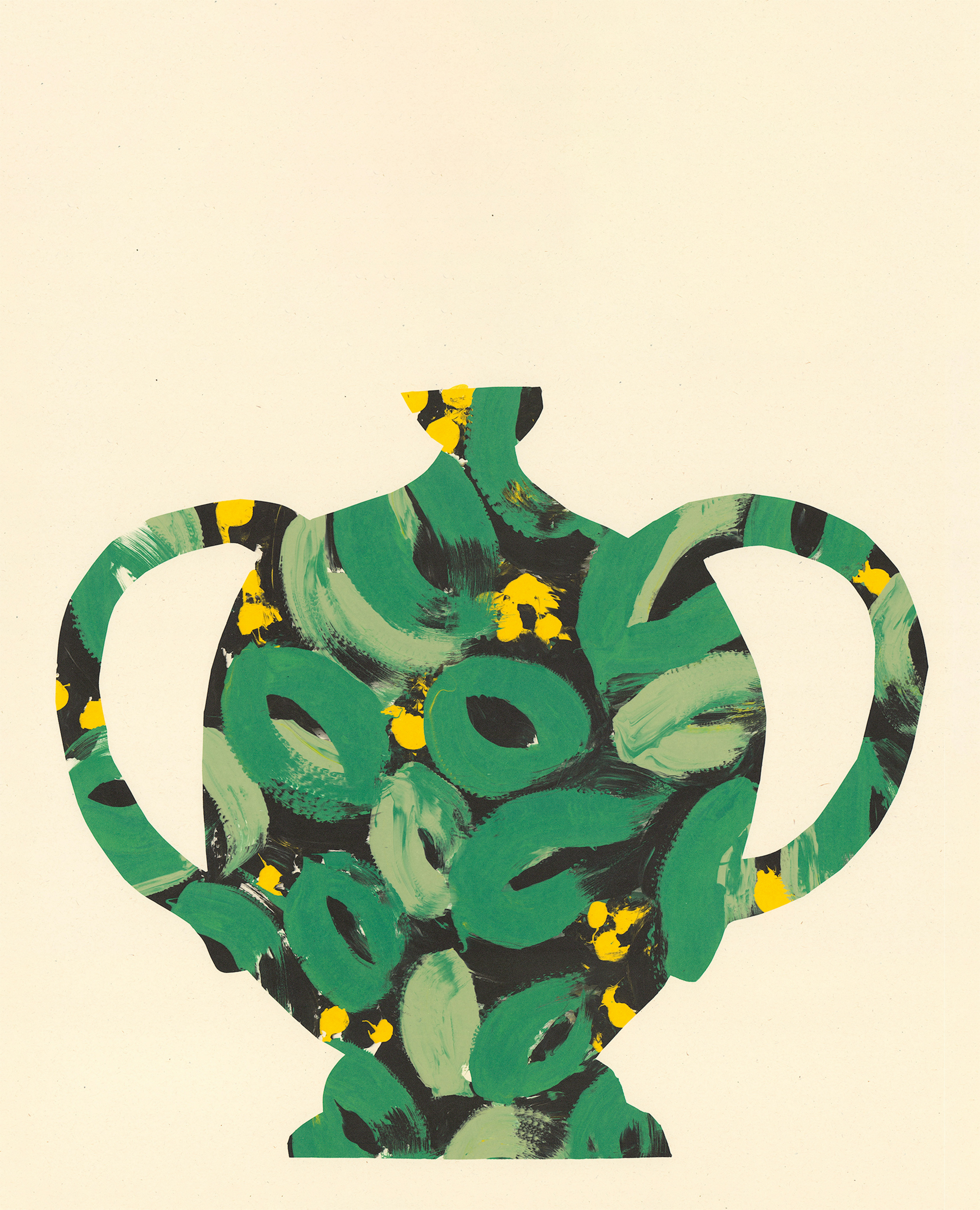This is a monoprint, printed into a screen that I exposed a cut out of a vase onto. There are a selection of different colour varieties.