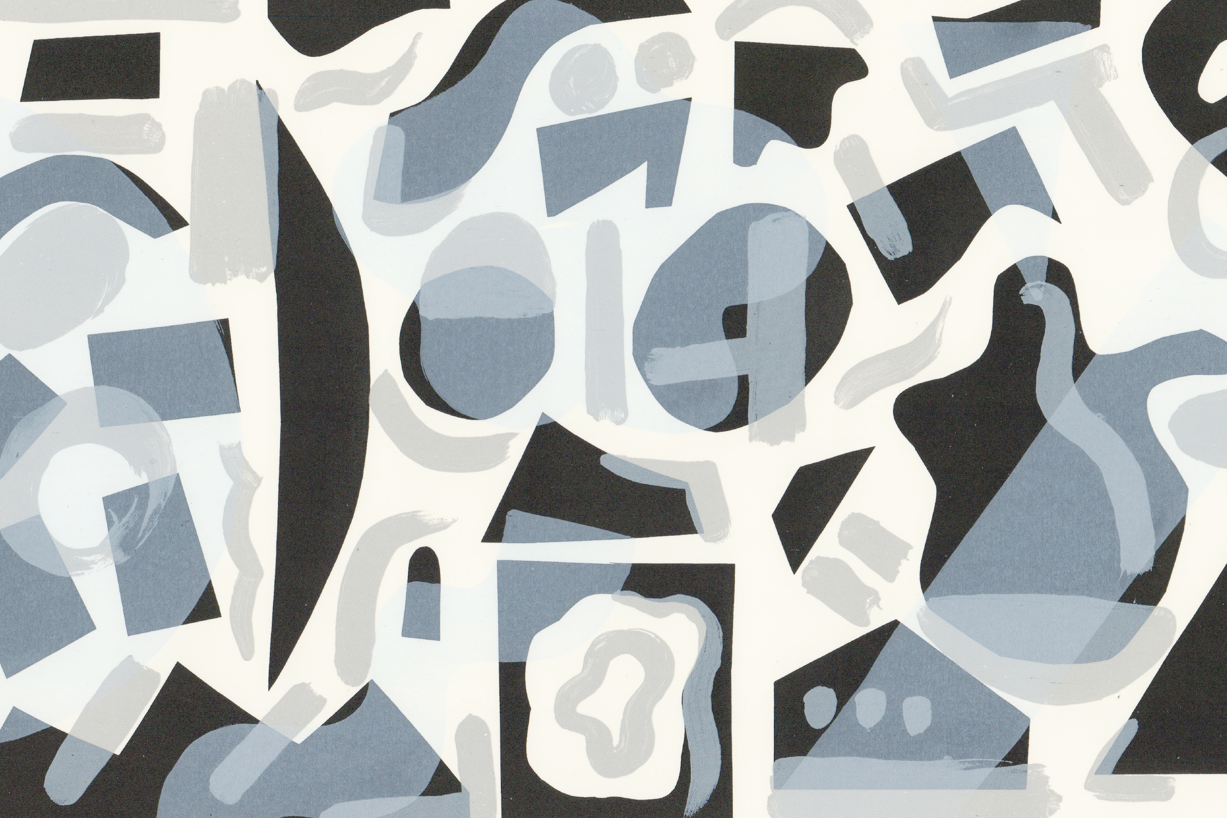 A black, grey and silver screenprint cmade from collaged cut out shapes and built up with loose brush strokes.